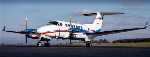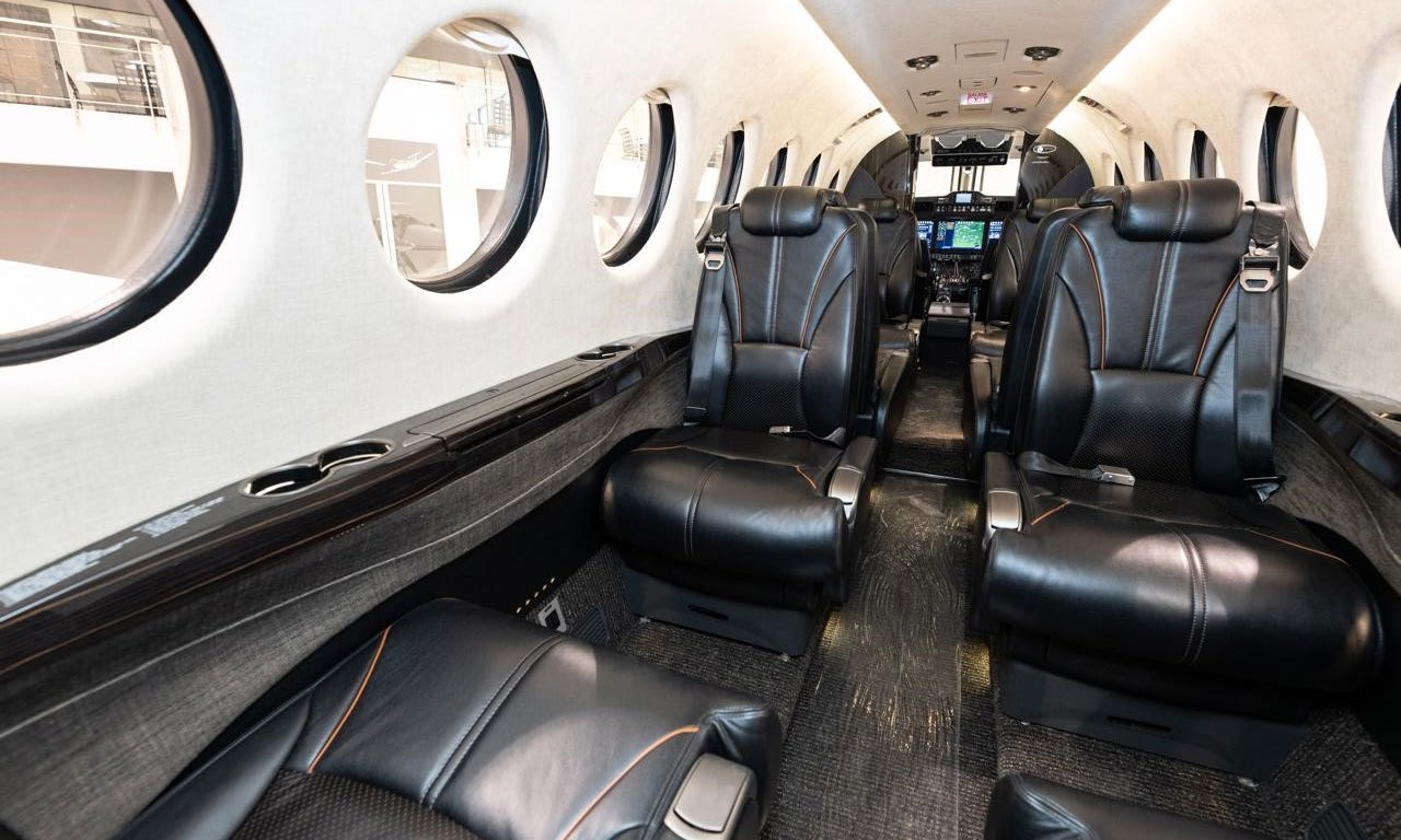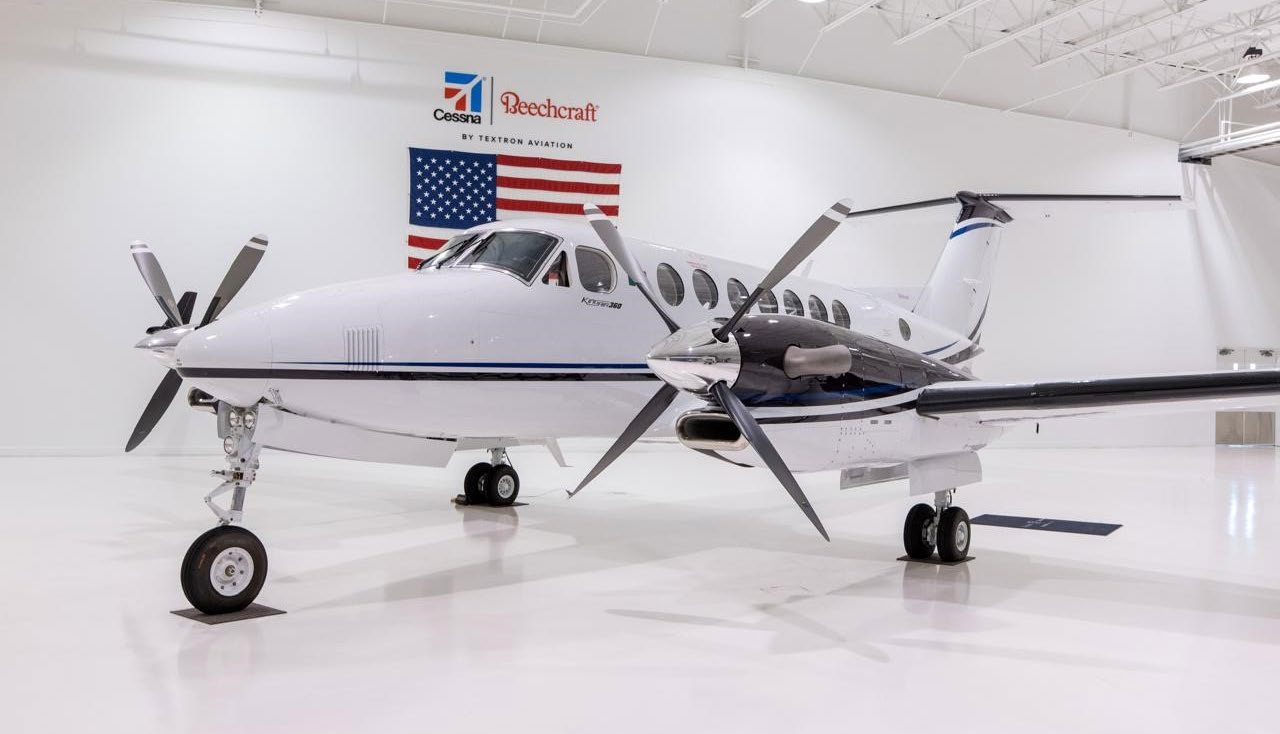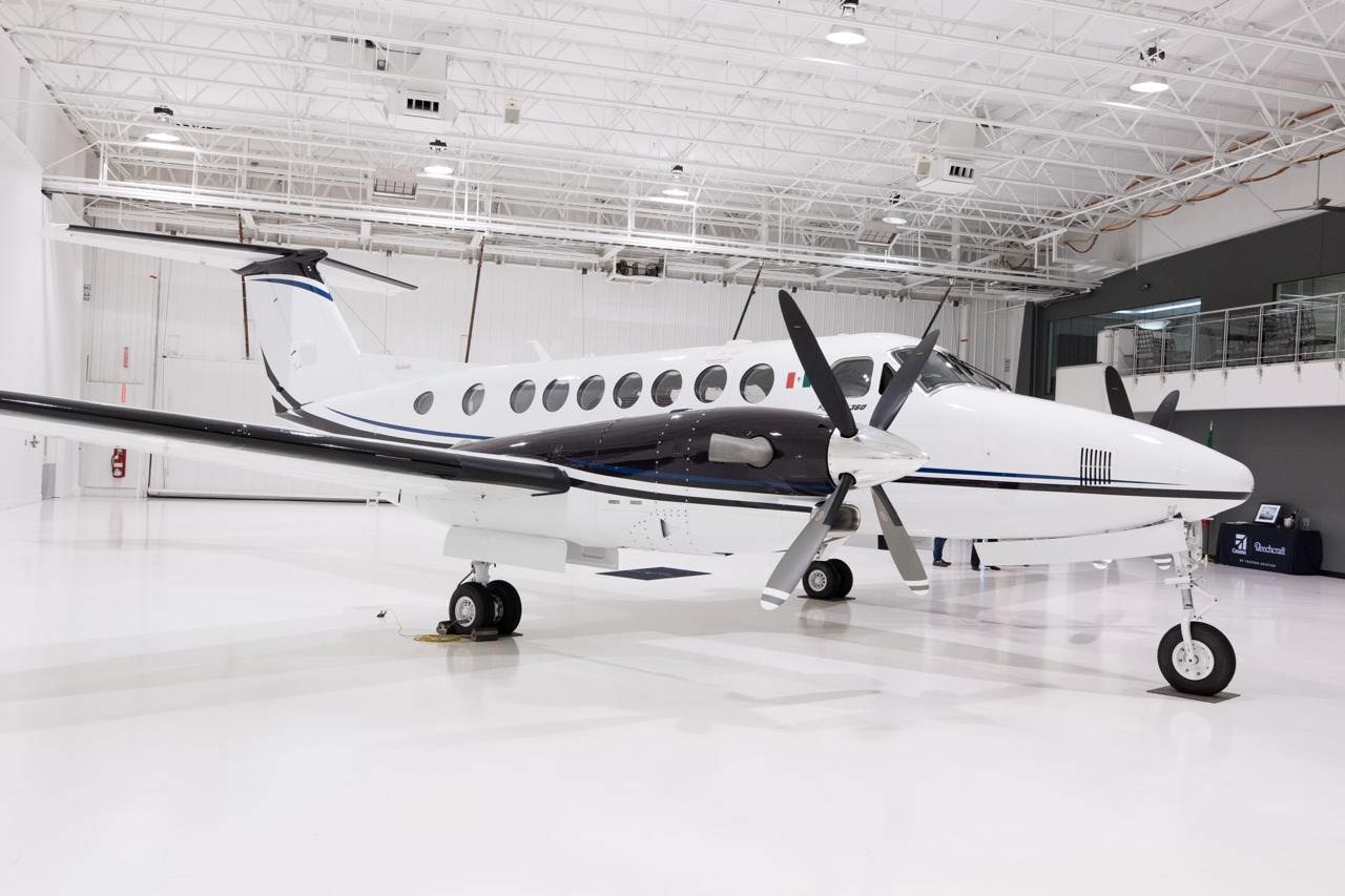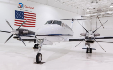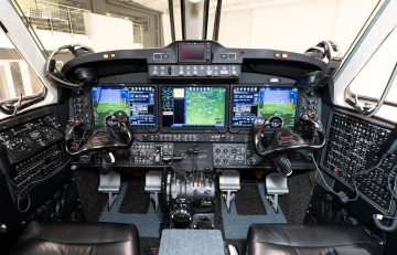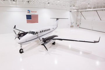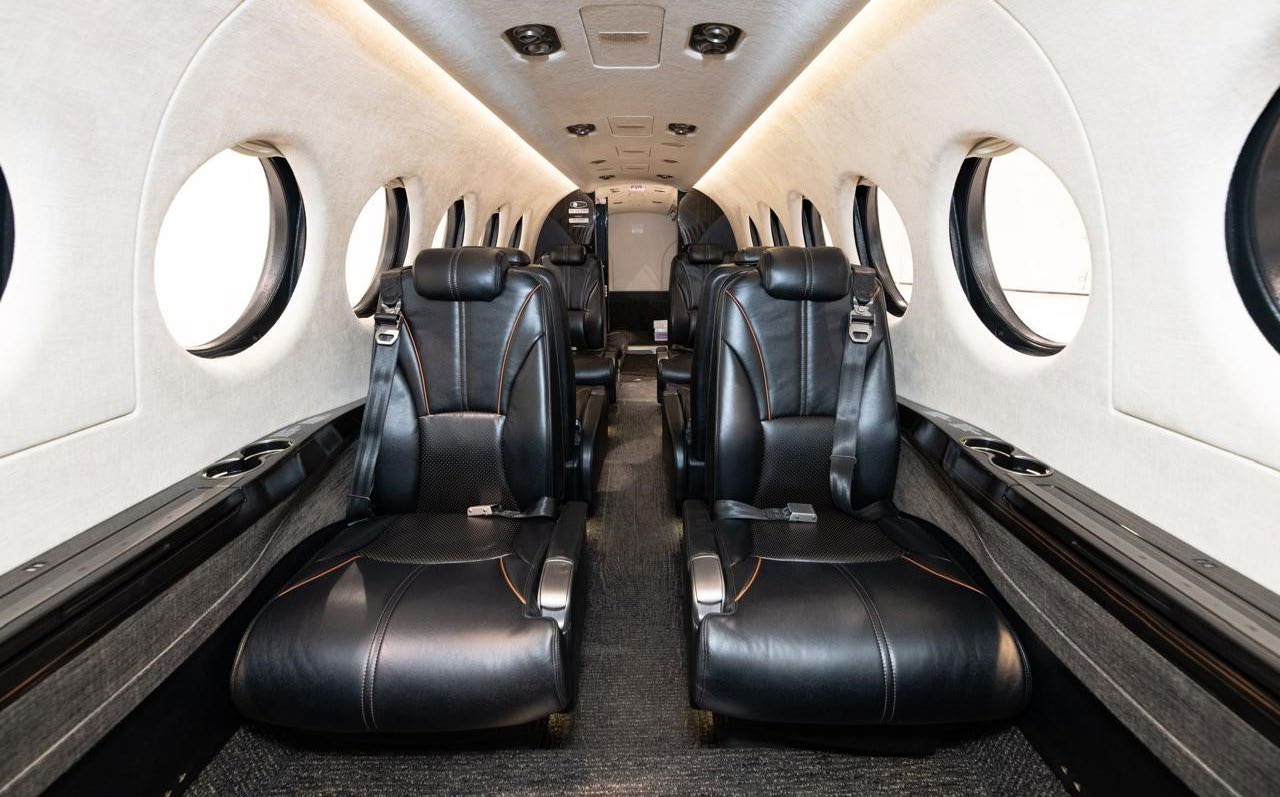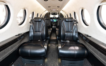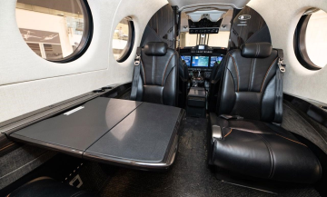 2021 Interior (Textron, Wichita) This King Air 360 offers a spacious cabin accommodating up to eleven (11) passengers comfortably and two (2) pilots. The interior is black leather, carpet and dark woodwork with white headliner and gray side walls. The forward cabin includes a four (4)-place club to include executive writing tables provided on both the left and rightside of the cabin and stow in the sidewall panels. The aft cabin features a four (4)-place club to include executive writing tables provided on both the left and right sideof the cabin and stow in the sidewall panels. The aft zone incorporates one (1) side-facing belted electric-flushing lavatory seat with privacy divider that’sexternally serviced. Two additional jump seats in baggage compartment |
