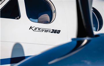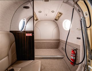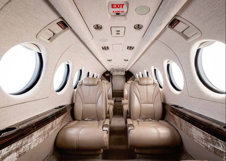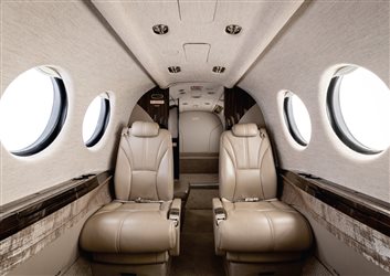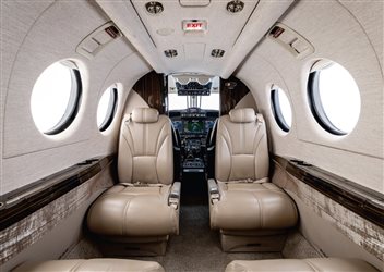(Original) This King Air 360 features a spacious cabin configured for nine (9) passengers. The interior is arranged with two four-place club seating groups, followed by a belted, side-facing lavatory. |