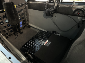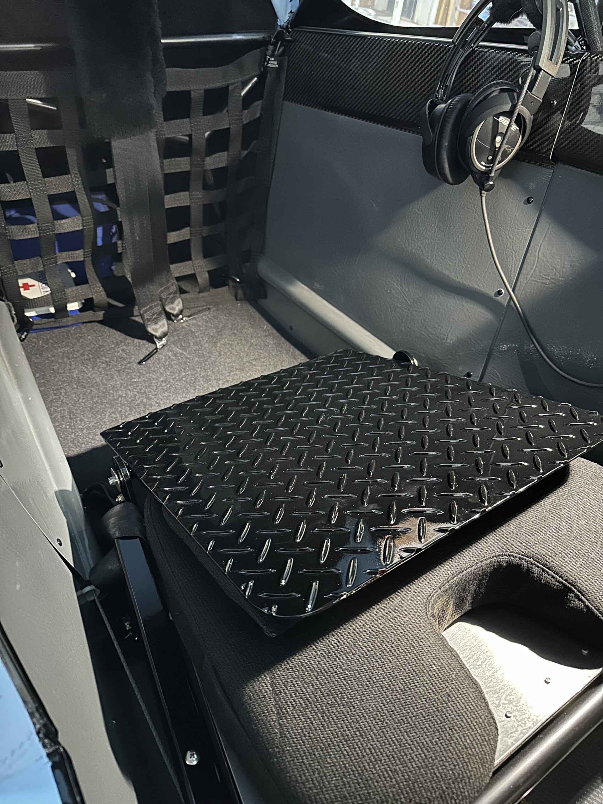 Black Fabric Interior Custom folding-back rear seat w/ storage compartment underneath Rosen Sunvisor Inertial Reel Harnesses |