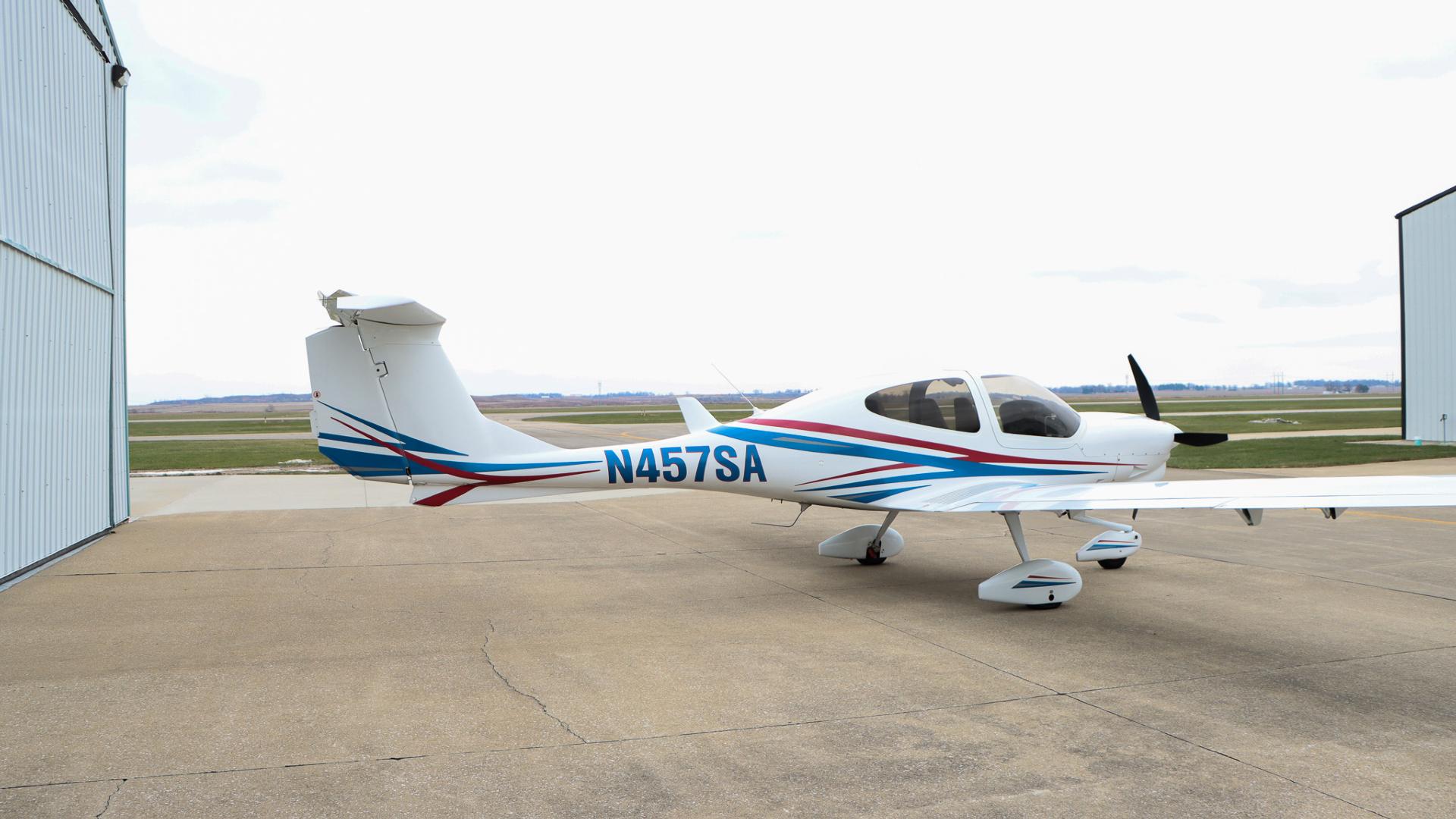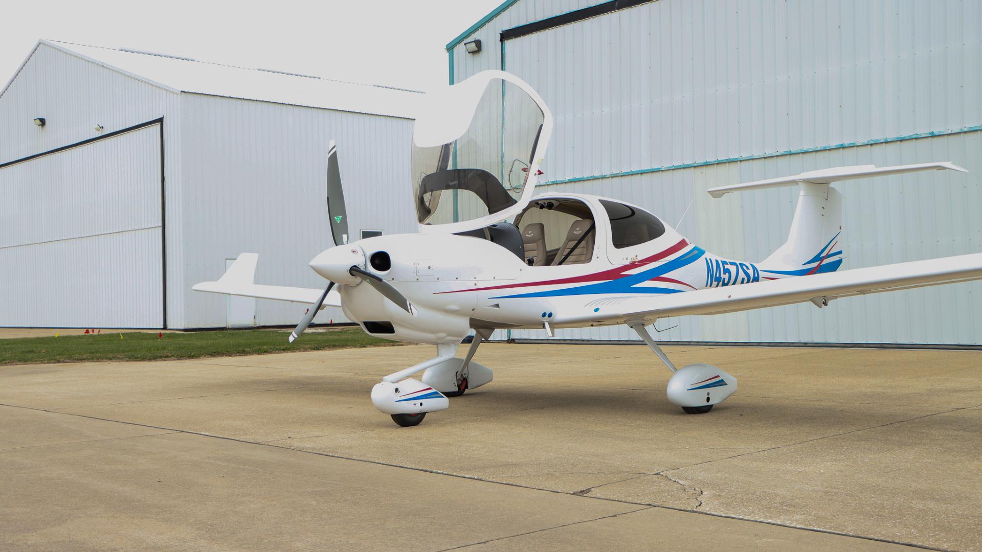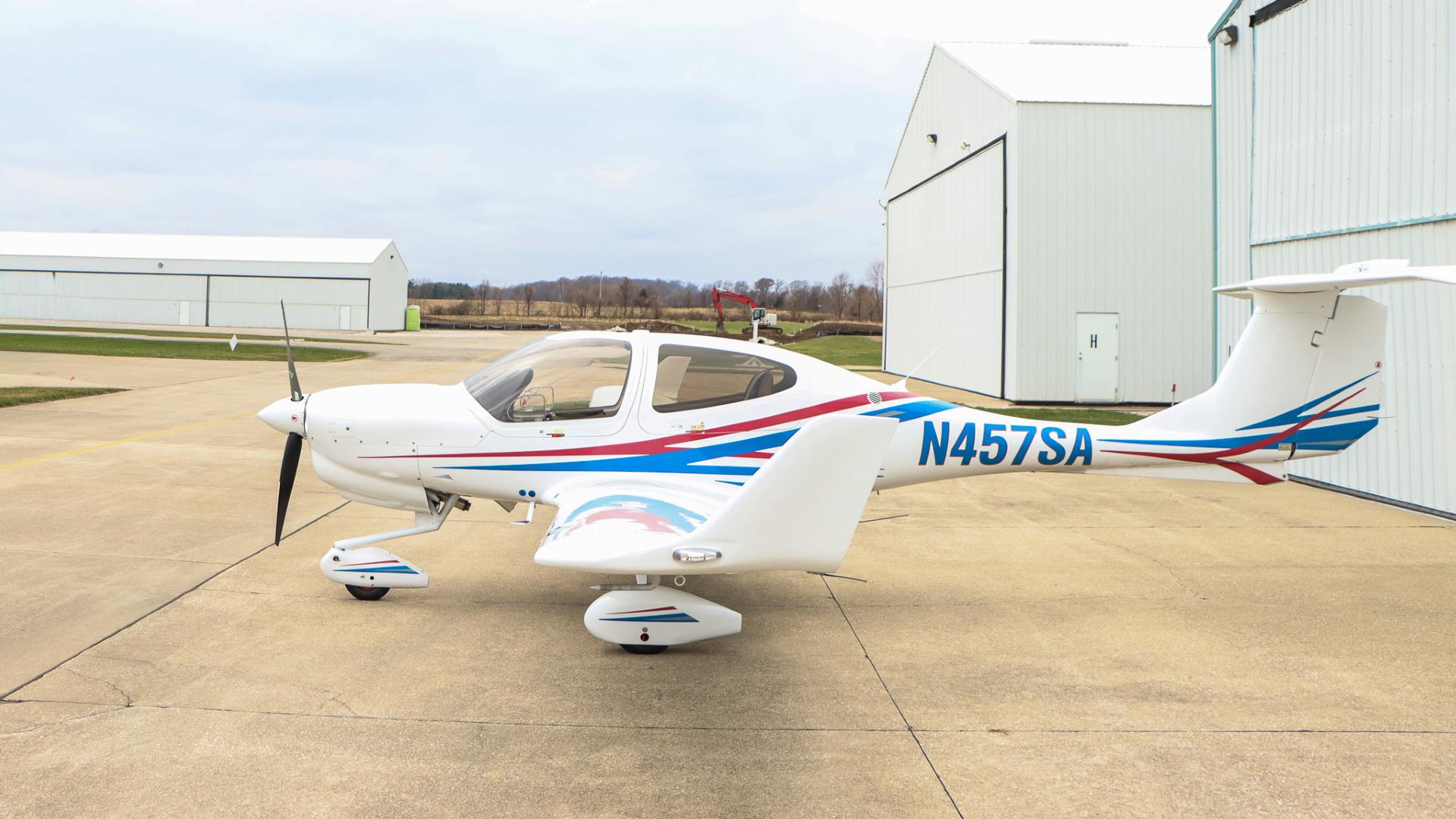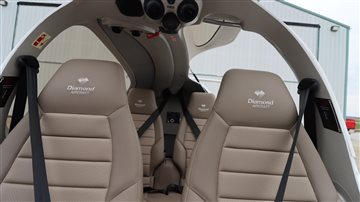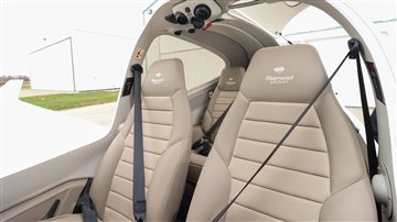 | Finished in a crisp white base accented by bold red and blue exterior striping, this aircraft turns heads on the ramp while maintaining Diamond’s signature aerodynamic elegance. | |